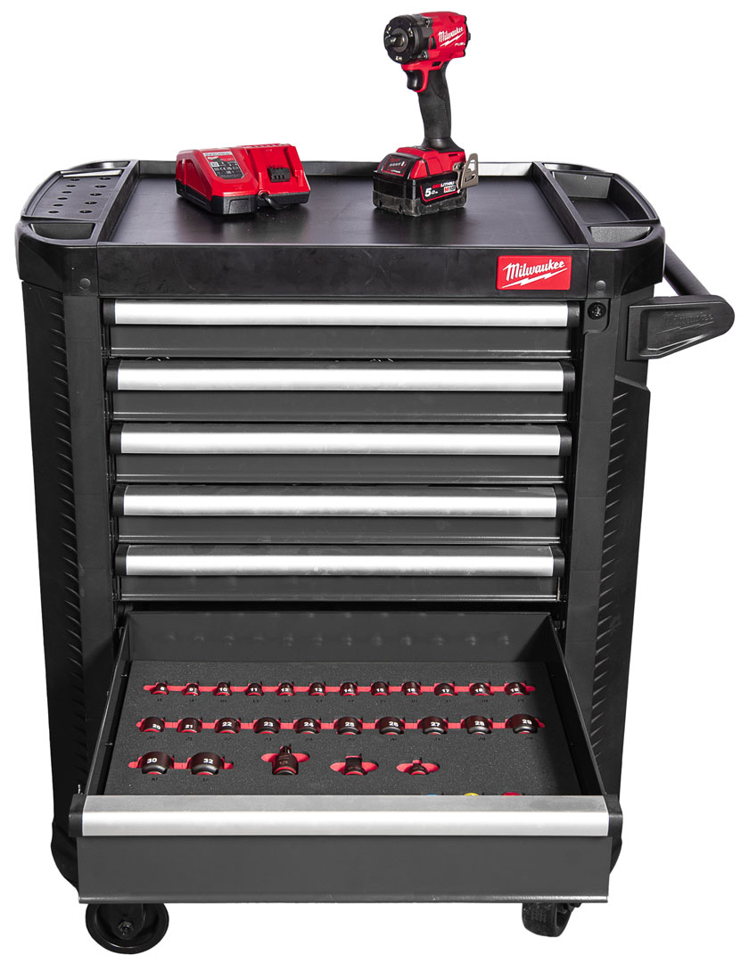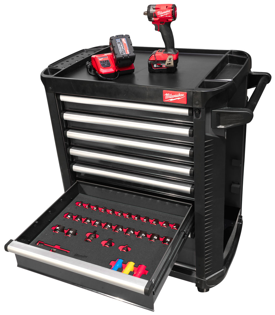 Wózek wyposażony jest w modułowy system wkładek TOOLGUARD™, który gwarantuje logiczne rozmieszczenie narzędzi i ich stabilność podczas transportu. W tym modelu tylko 5 z 7 szuflad są fabrycznie wyposażone we wkładki narzędziowe Milwaukee, pozostałe szuflady pozostają puste i mogą być indywidualnie zorganizowane zgodnie z potrzebami użytkownika.