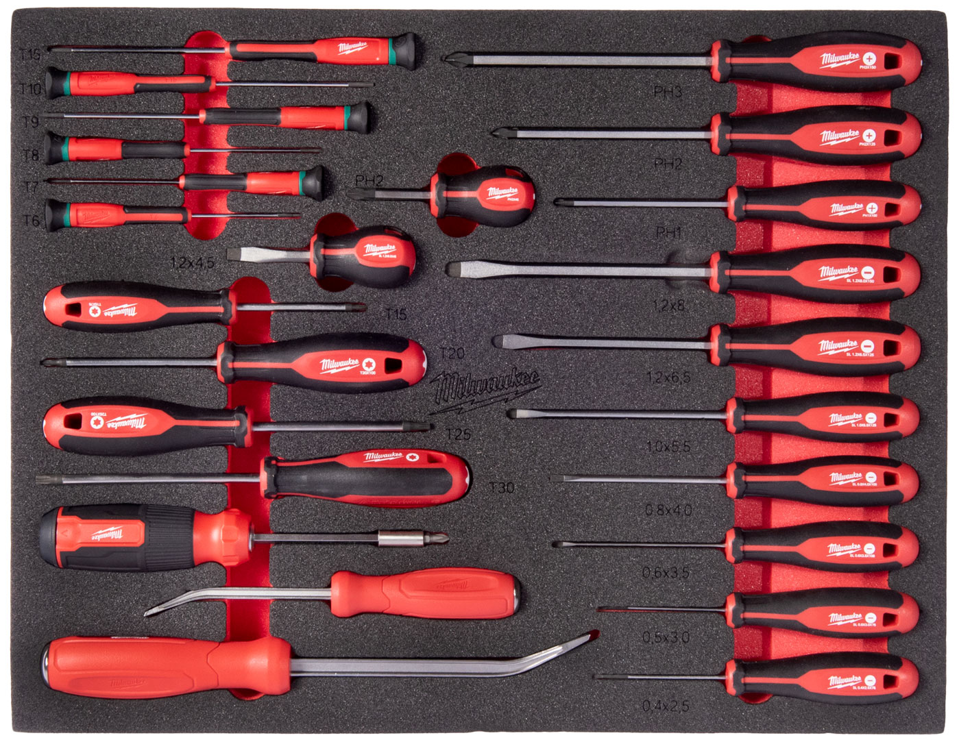 Wkrętaki SL (3–8 mm), PH (PH1–PH3), TORX (TX6–TX30), wkrętak wielobitowy z magazynkiem oraz zestaw bitów. Dodatkowo narzędzia do podważania. Rękojeści Tri-Lobe zapewniają wysoki moment obrotowy i komfort pracy.