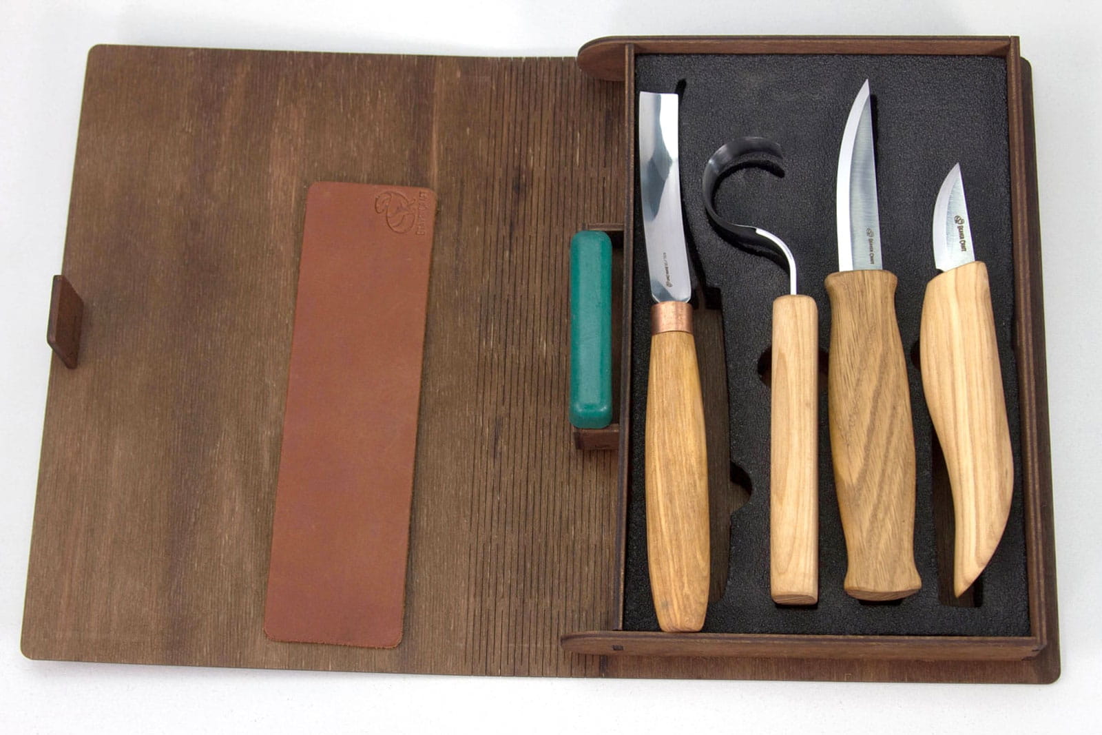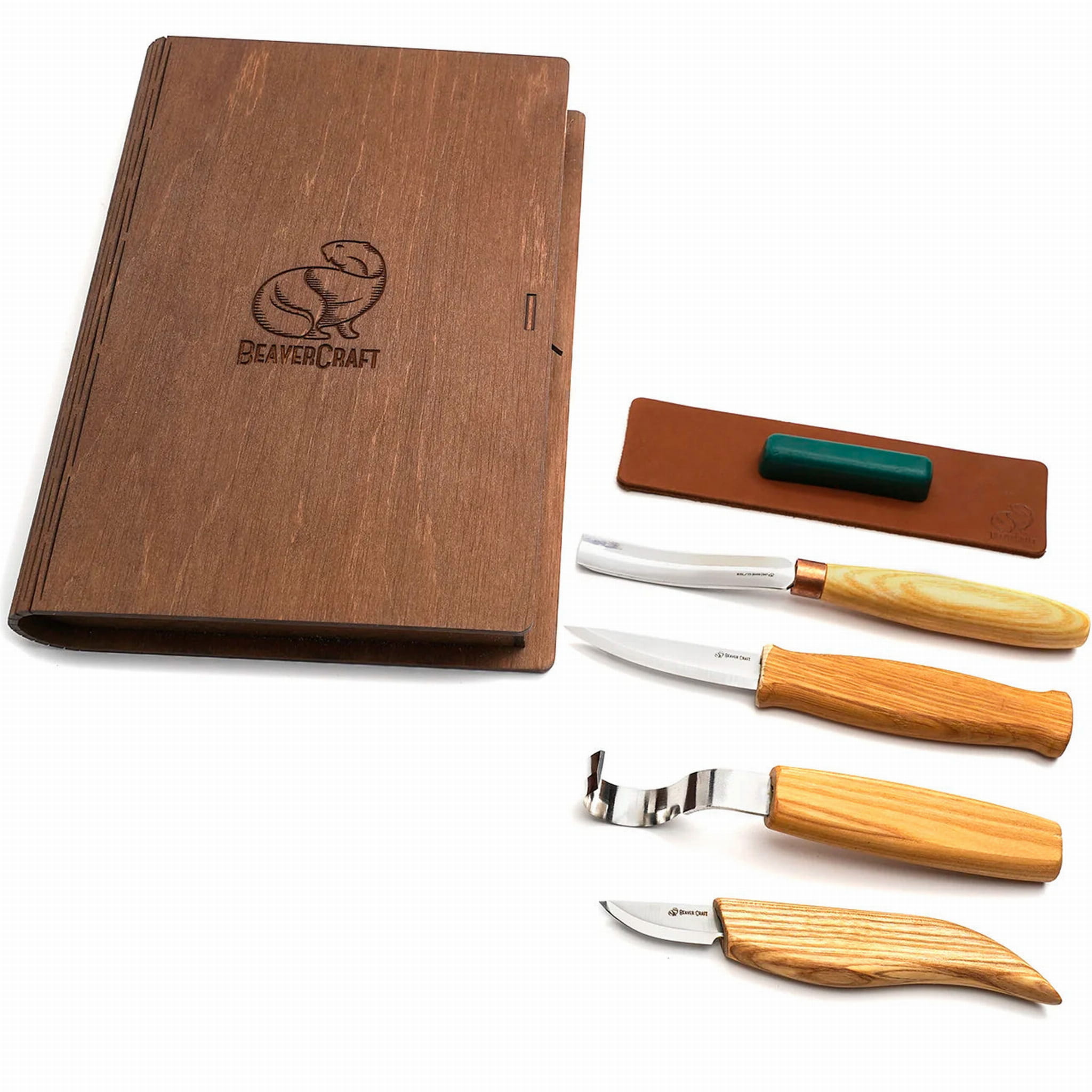 Zestaw do rzeźbienia BeaverCraft w drewnianym etui, 4 narzędzia + akcesoria do polerowania S43 Book