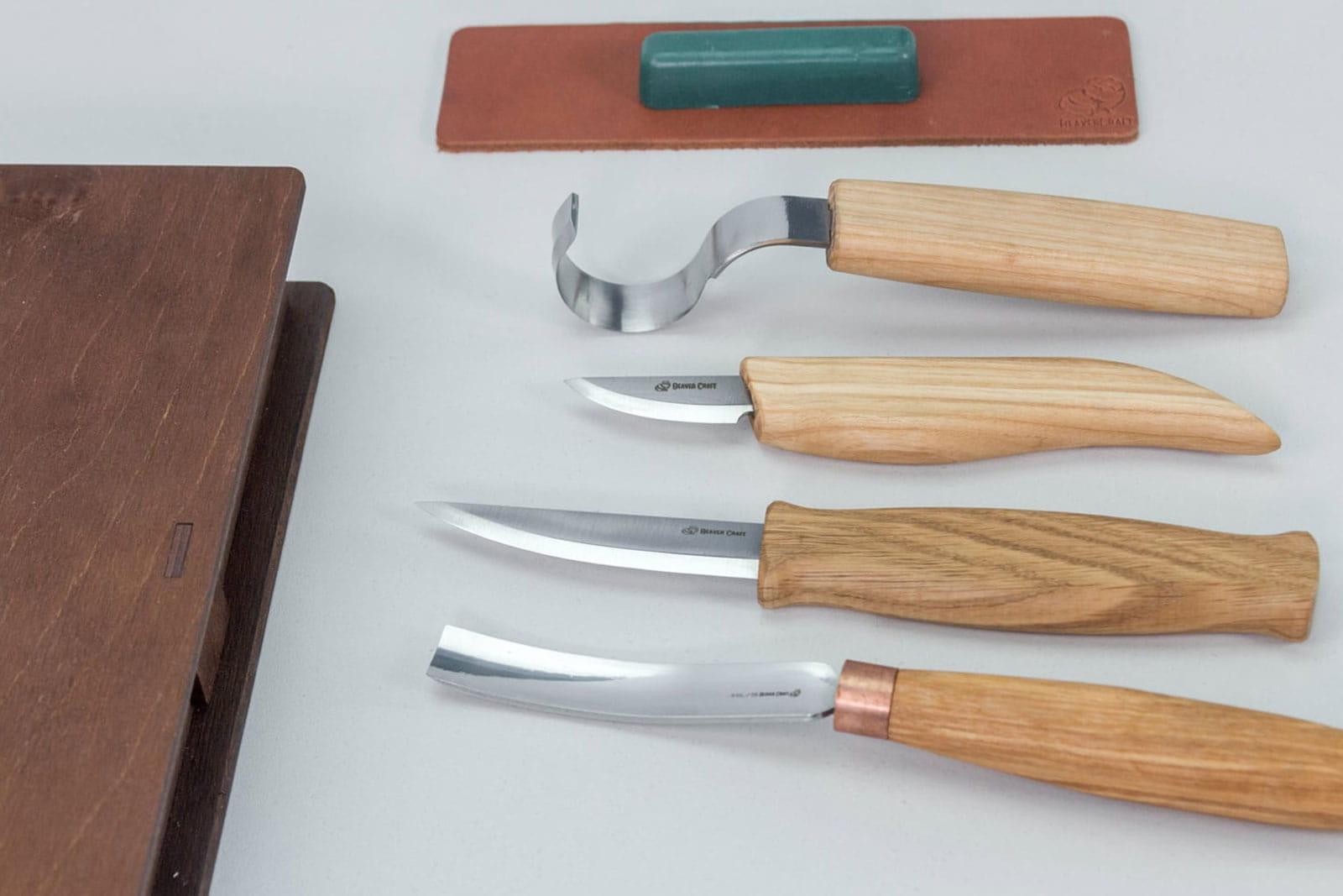 Znajdziemy tu narzędzia do wykonywania płaskorzeźby, drzeworytu, rzeźby geometrycznej (chip carving) oraz wykonywania łyżek, kuks, misek, itp. W ofercie producenta znajdują się także akcesoria do polerowania ostrzy – polerki ze skóry, pasty polerskie, itd. Ostrza narzędzi BeaverCraft wykonane są z wysokogatunkowej stali stopowej bromowo-wanadowej, utwardzanej do 57-58 HRC. Ostrza narzędzi dobrze zachowują ostrość a jednocześnie są dość łatwe w ostrzeniu i polerowaniu. Ergonomiczne rękojeści narzędzi wykonane są z twardych gatunków drewna (jesion, dąb) i są zabezpieczone olejem lnianym przez producenta. |