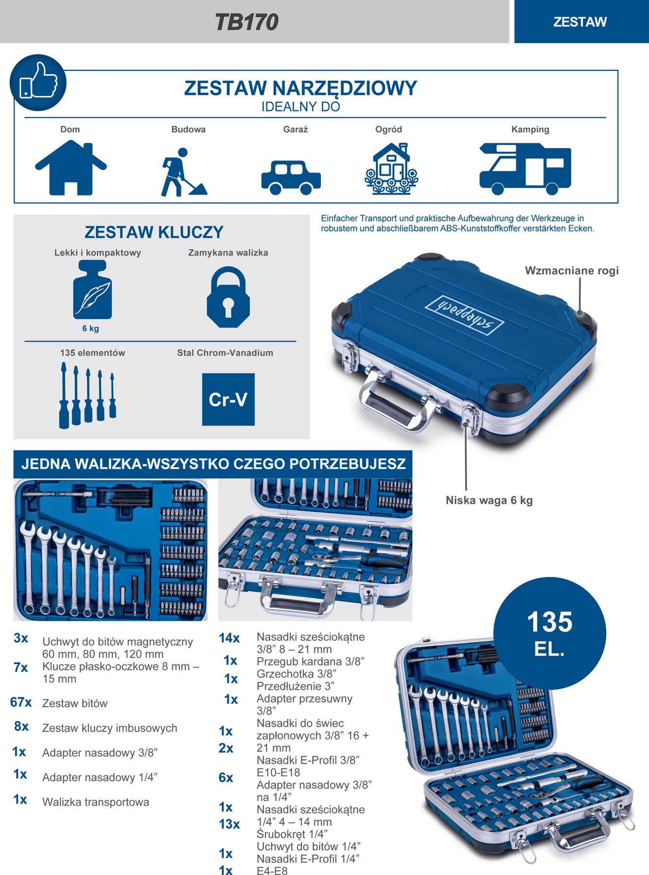 Zestaw narzędzi w walizce Scheppach TB170 - 135 części. Precyzyjny i funkcjonalny zestaw narzędzi w praktycznej walizce od renomowanego producenta Scheppach, obejmujący 135 elementów, które sprawdzą się podczas różnych prac domowych i profesjonalnych. Komplet został zaprojektowany z myślą o użytkownikach, którzy cenią sobie jakość i wygodę w jednym zestawie.