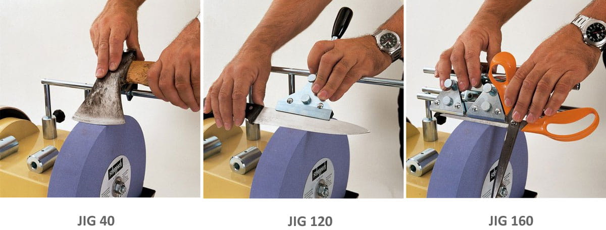 Zestaw osprzętu Scheppach KIT1 do szlifierki stołowej TIGER2500 zawiera: JIG40, JIG160, JIG120.